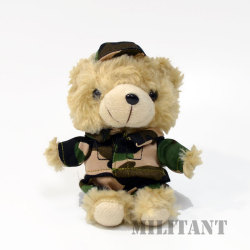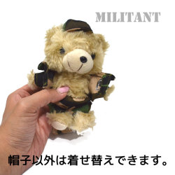 ボールチェーン付きの迷彩のくまのぬいぐるみです。キーホルダーにもなります。全長約16cmです。着衣は防止以外脱げますので、着せ替え等も可能です。バリエーションでブルーインパルスパイロットスーツバージョンも販売中です。